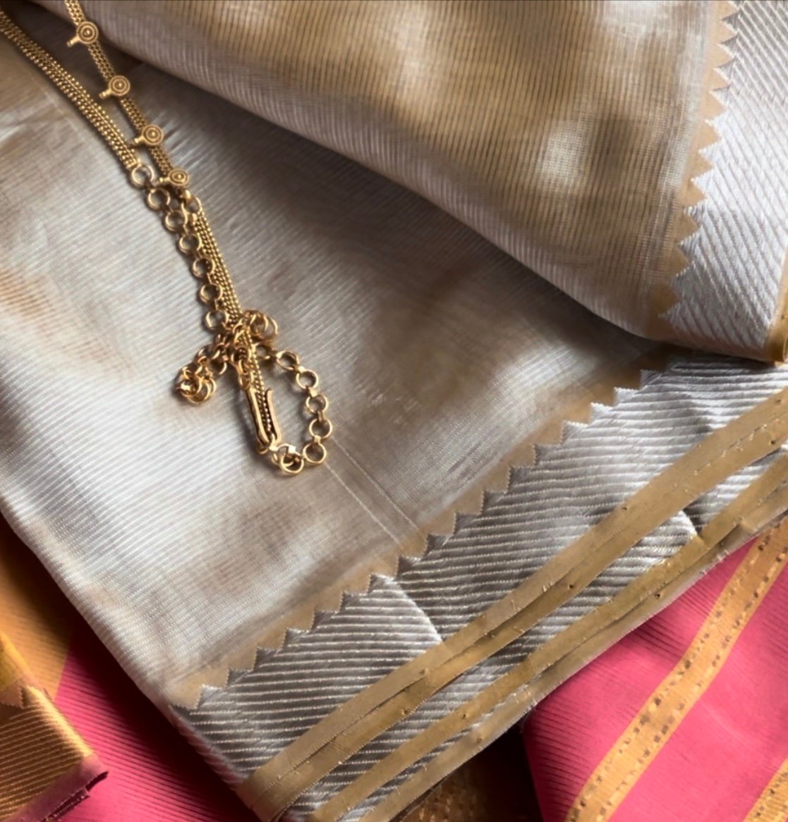 Bloc á Main Chandni – where golden warmth meets silver serenity, handwoven in the moonlit rhythm of Mangalgiri looms.